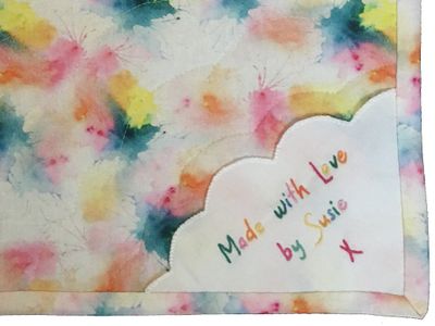 I positioned the corner of a cotton handkerchief with a scalloped edge into the lower right hand corner and secured it with the binding. The label remains open so it is also a little pocket that a message can be tucked in to.