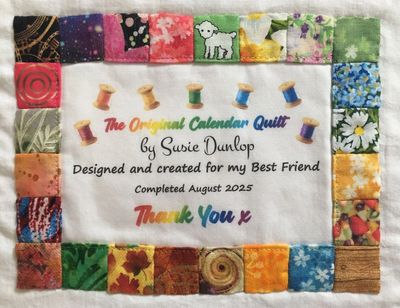 The text and cotton reels were printed on special fabric with an inkjet printer which I then framed with 24 little squares - using two of the fabrics from each of the twelve blocks.